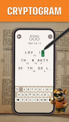 Bereid je voor op een fascinerende reis van intellectuele ontdekking met Codewords: Cryptogram Puzzle. Duik in een wereld waar cijfers de sleutel zijn tot verborgen wijsheden en boeiende verhalen. Elk cryptogram presenteert een unieke uitdaging: ontcijfer de gecodeerde zinnen en onthul de briljante citaten, inspirerende gezegden of memorabele songteksten die erachter schuilgaan. Het is een test van logica en taal, ontworpen om uw denkvermogen aan te scherpen terwijl u geniet van de voldoening van het kraken van codes.