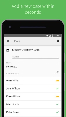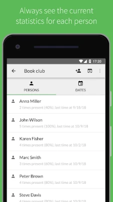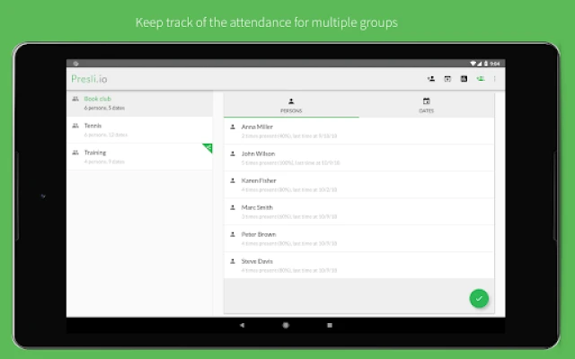 Optimaliseer het beheer van al uw groepen met Presli.io, de gestroomlijnde oplossing voor iedereen die een team, club of project coördineert. Organiseer moeiteloos uw deelnemerslijsten en plan afspraken met precisie, alles overzichtelijk gepresenteerd en toegankelijk via uw telefoon, tablet of het web. Registreer de aanwezigheid met een simpele tik, waarbij u kunt kiezen uit heldere statussen zoals 'aanwezig', 'verontschuldigd' of 'afwezig', zodat u altijd een actueel overzicht heeft van wie er wanneer deelneemt.