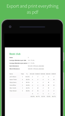 Duik dieper in uw groepsinformatie met de veelzijdige notitiefunctie; voeg gedetailleerde aantekeningen toe aan elke afspraak, persoon of groep om alle relevante details vast te leggen. Voor uitgebreide data-analyse kunt u eenvoudig uw groepsgegevens exporteren als PDF of CSV, klaar om te worden geïmporteerd in uw favoriete spreadsheetprogramma voor het creëren van aangepaste rapporten en diagrammen. Bovendien biedt Presli.io direct in de app inzichtelijke statistieken, zodat u trends in de aanwezigheid snel en overzichtelijk kunt analyseren. Presli.io is met veel liefde en technische precisie ontwikkeld door couchbits in Konstanz.