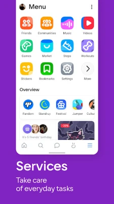 VK is meer dan alleen communicatie; het is een centrale hub voor entertainment, nieuws en persoonlijke groei. Geniet van boeiende livestreams, deel uw mooiste momenten via foto's, ontspan met een verscheidenheid aan games en blijf op de hoogte van interessante onderwerpen via thematische nieuwsfeeds. Verbreed uw horizon door te luisteren naar informatieve podcasts of upload uw eigen verhalen en inzichten. Voor degenen die hun welzijn serieus nemen, biedt VK ook een unieke integratie met uw apparaat om uw gezondheid bij te houden en actief te blijven. Concurreer vriendelijk met vrienden om te zien wie de meeste stappen per dag zet en klim naar de top van het klassement na een verkwikkende wandeling.