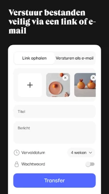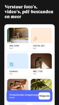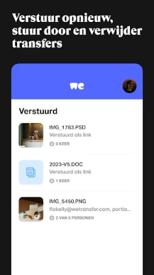 WeTransfer maakt het moeiteloos om grote bestanden te verzenden en ontvangen, tot wel 200 GB. Deel foto's en video's in originele kwaliteit, overal en altijd. Controleer de status van je transfers en krijg direct toegang tot ontvangen bestanden, inclusief eerdere transfers van je laptop. Simpel, snel en efficiënt.
